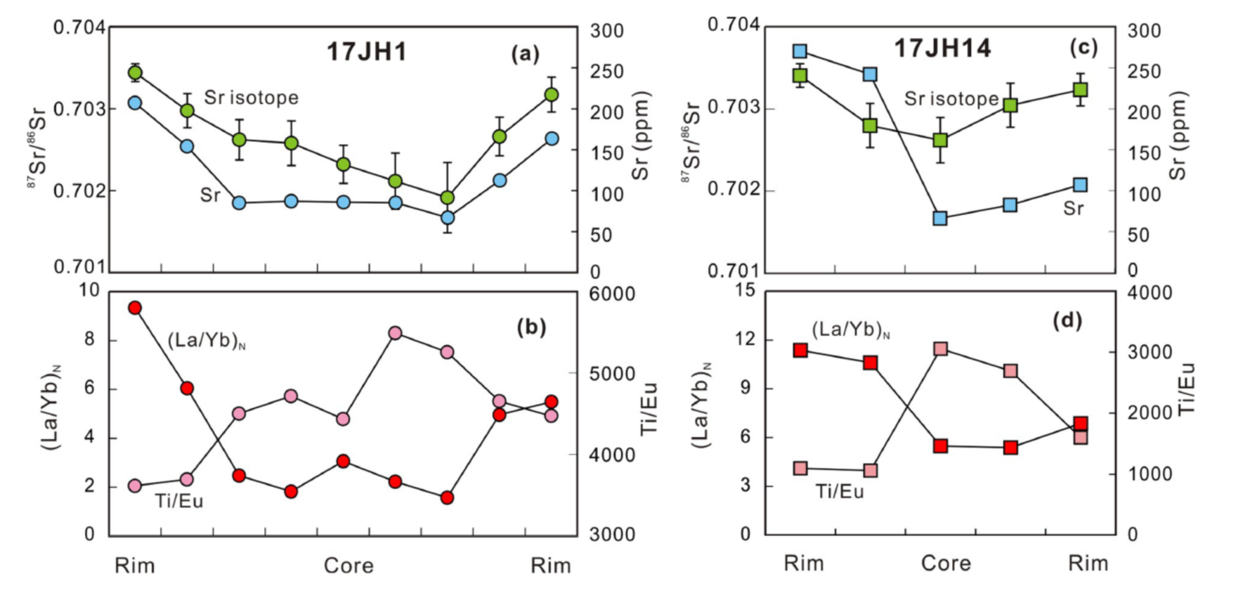 图3. 二辉石岩(17JH1)和异剥橄榄岩(17JH14)中单斜辉石Sr同位素及微量元素组成的核边变化