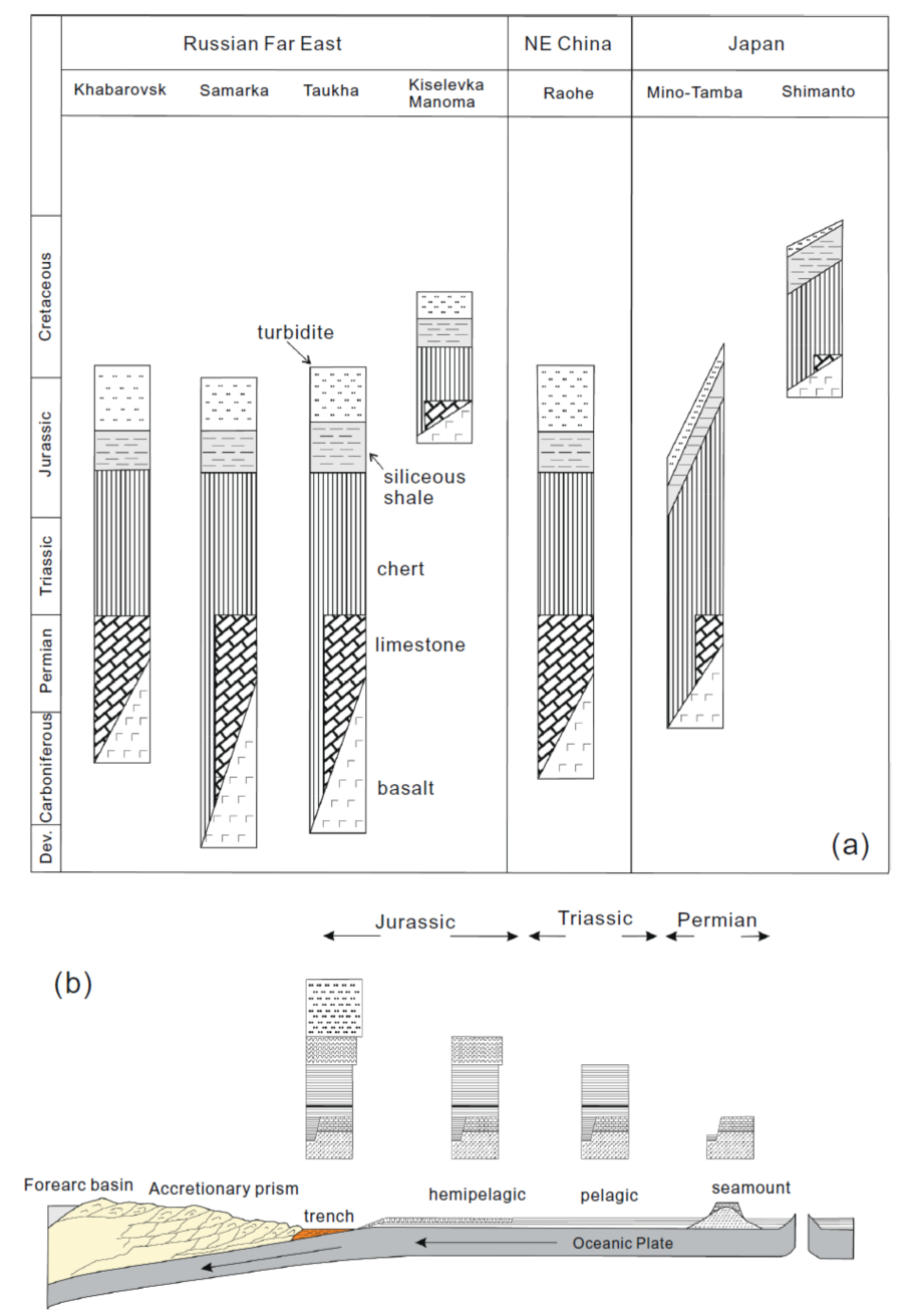 图2 东北亚大陆边缘中生代大洋板块地层的重建(a)与形成过程(b)