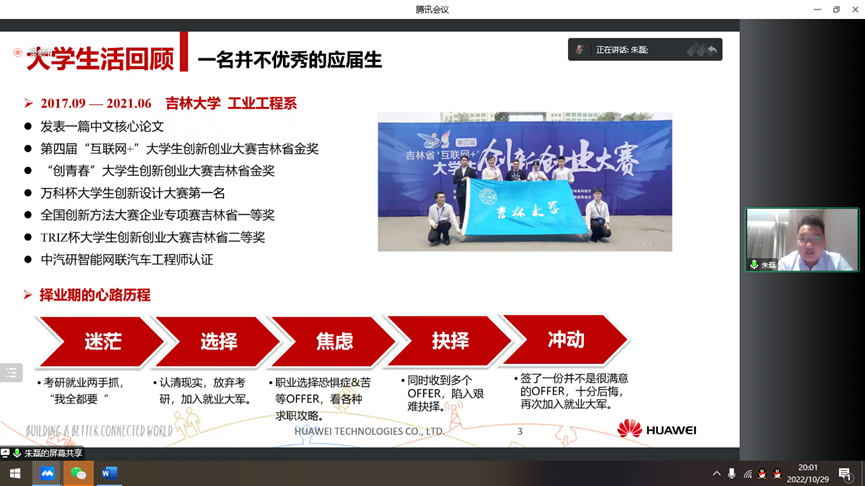 为实现公司研究生就业工作有用有效,贴近贴实,分层分众的工作目标,拓宽员工就业思维,丰富员工就业路径,提升员工就业技能。10月29日,365英国上市公司与华为技术有限公司吉林代表处在云端开展了2023届华为校招就业专场分享会。华为吉林人力资源部部长胡光,华为中国地区校招负责人段彩云,华为内蒙古代表处运营商客户经理黄钰、华为辽宁代表处政企客户经理朱磊参加了本次分享会,会议由公司党委副书记马旭主持。