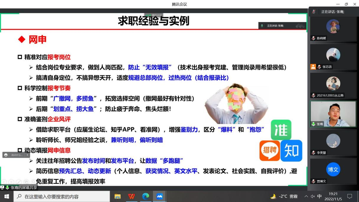 其次,张骞从网申、笔试、面试和录用四个方面介绍了自己的经验和教训。他强调,在网申时要精准对应报考岗位,科学控制报考节奏、准确鉴别企业风评,动态填报网申信息;在面试时既要表达“你想去”的强烈意愿,也要表现“你能去”的足够能力。