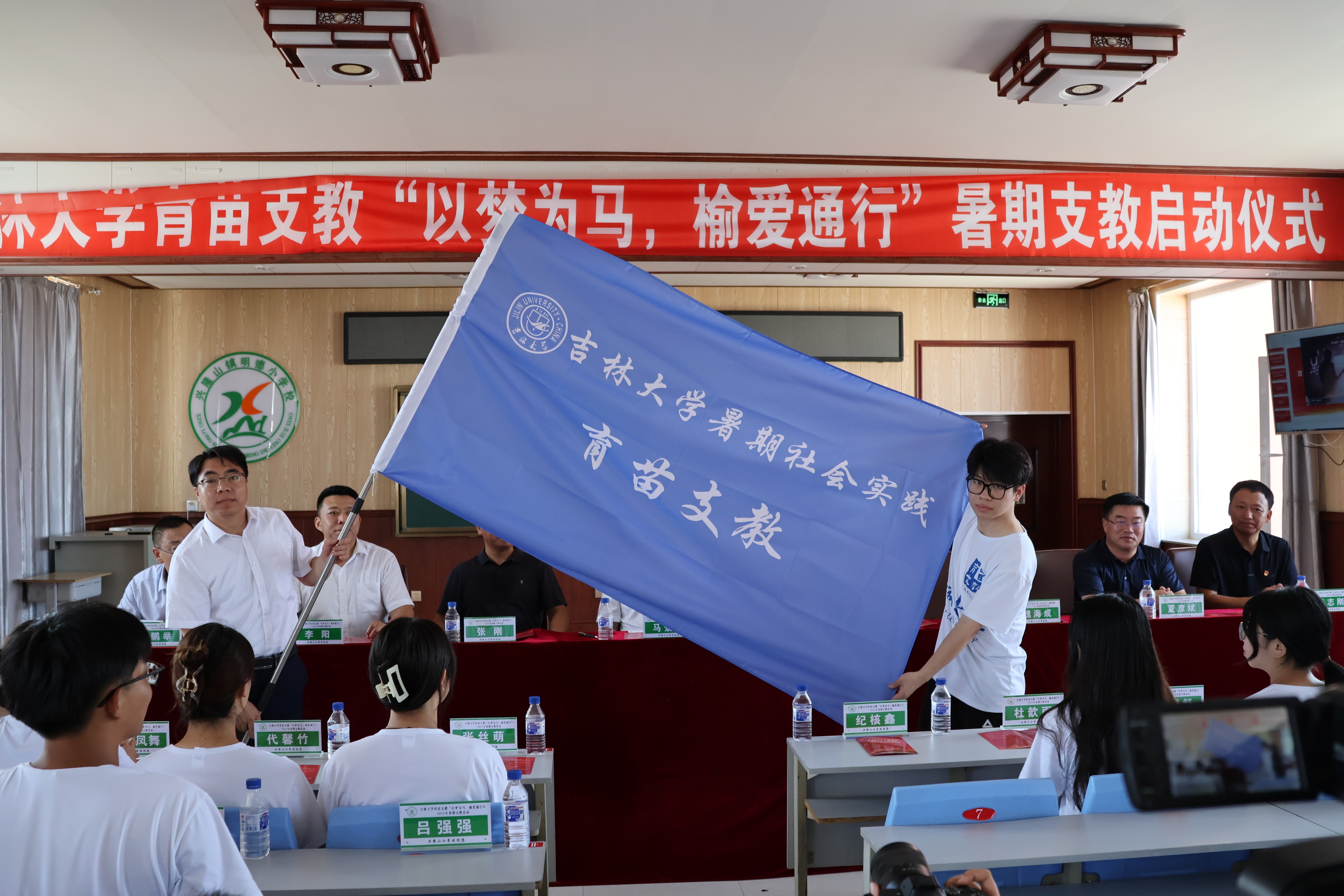 魏海成副书记向支教队队长吕强强进行“365英国上市公司育苗支教社团暑期社会实践”授旗