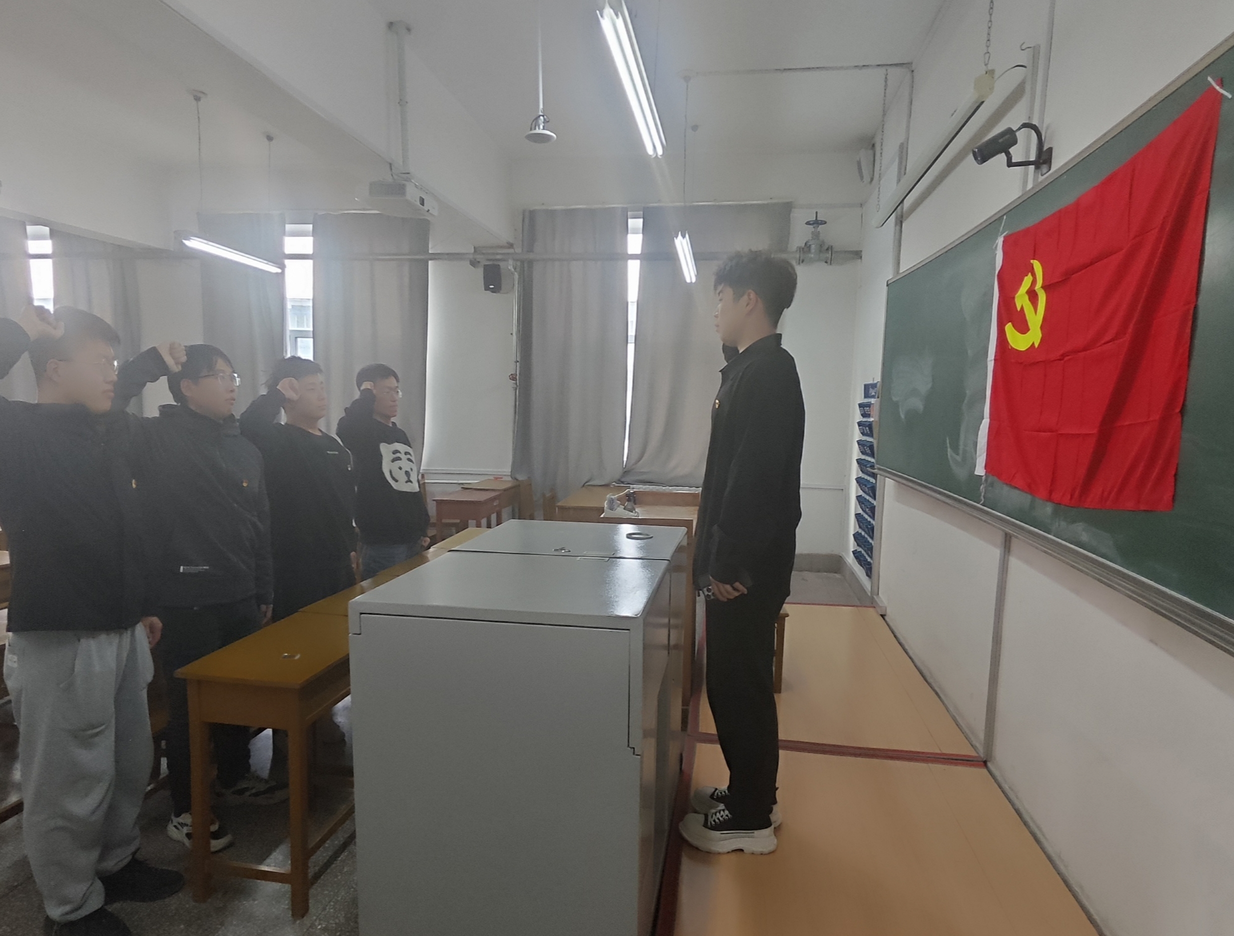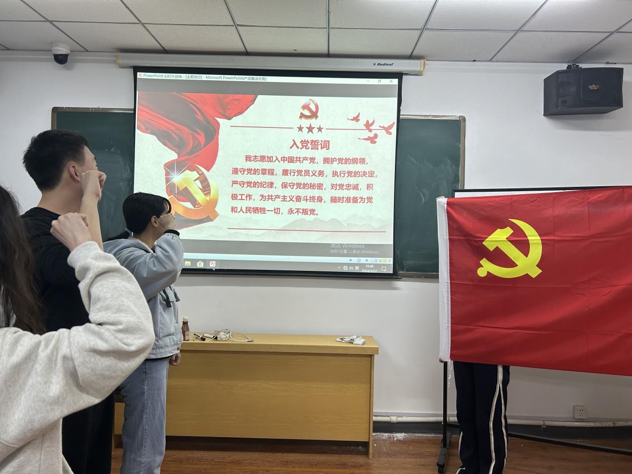 宣誓仪式在雄壮的《国际歌》中拉开帷幕。随后,老党员代表为新发展党员佩戴党徽,研究生辅导员姜鹏老师为新发展党员赠送《师魂-记新中国第一代地质学家张秋生》书籍。新发展党员在马旭副书记的带领下,面对党旗,紧握右拳,庄严宣誓,以铿锵有力的誓言宣示着永远跟党走的决心。接着,新发展党员代表进行了发言,表示要始终忠诚于党和人民,以身边的优秀党员同志为榜样,不断加强理论学习,提高思想认识水平,将智慧和热血融入到党和国家的伟大事业中去。紧接着入党积极分子代表进行了发言,表示要经常检查和弥补自身不足,始终保持与党组织的密切联系,认真学习党的理论知识,以高标准严格要求自己,争取成为一名合格的党员。