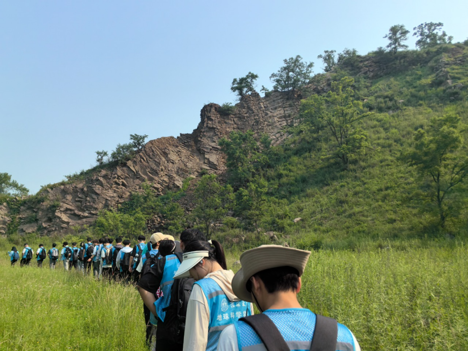 伴着朝阳,2023级暑期长春周边认识实习队踏上新的征程,带队教师与2023级全体本科生乘坐大巴车,出发前往西尖山。实习期间,同学们在老师的专业引领下,全面考察了西尖山的各个地质特征点,观察学习玄武岩的柱状节理构造、火山锥的成因机制、岩石的结构特性以及地质构造的演变脉络。同学们认真聆听讲解,细致记录,并积极提出自己的疑问和观点,现场学习氛围浓厚且活跃。