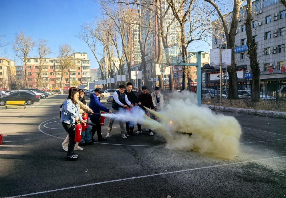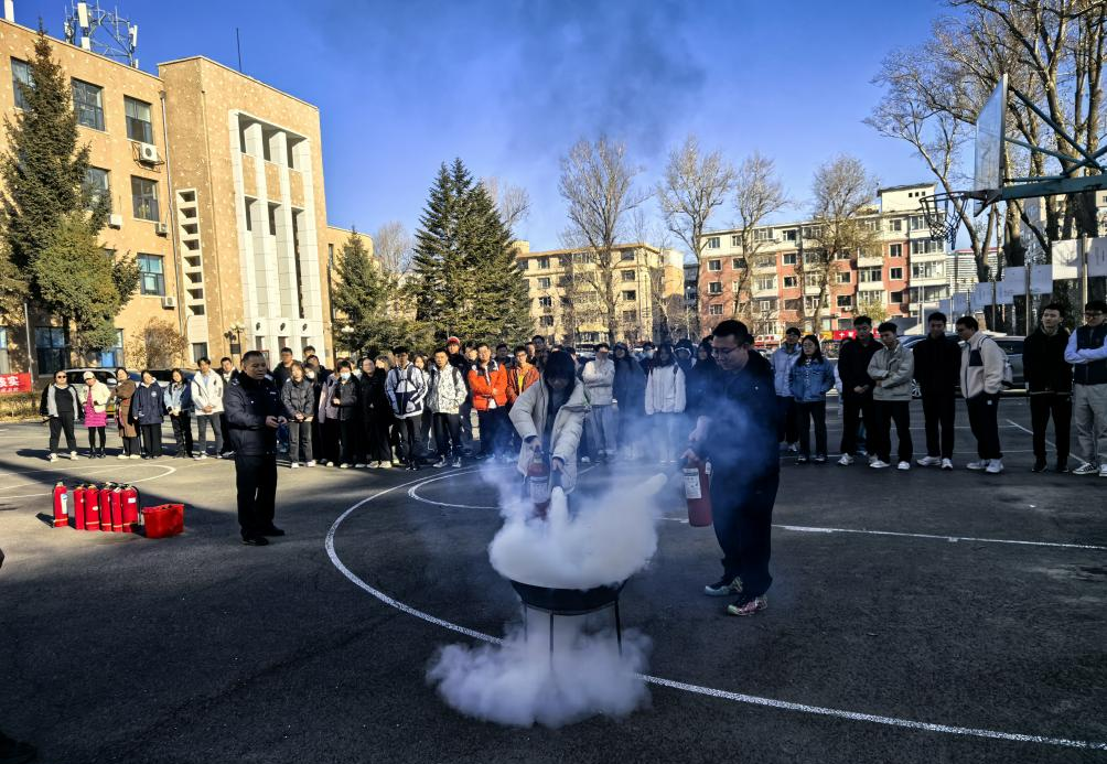 讲座结束后,在场师生在保卫处老师的指令下进行消防演练活动,同学们在楼层疏散引导员的指挥下,低伏姿势捂住口鼻,有序地向鸽子楼外撤离。在室外,老师向同学们讲解了干粉灭火器和二氧化碳灭火器的使用方法,指导同学们正确使用灭火器扑灭明火。