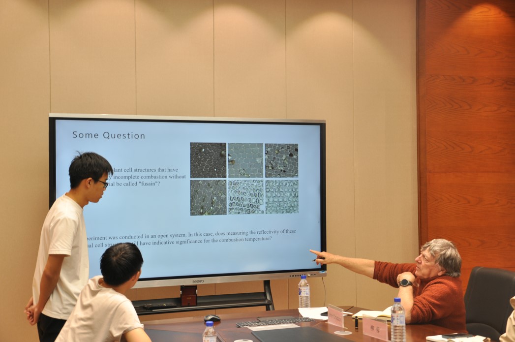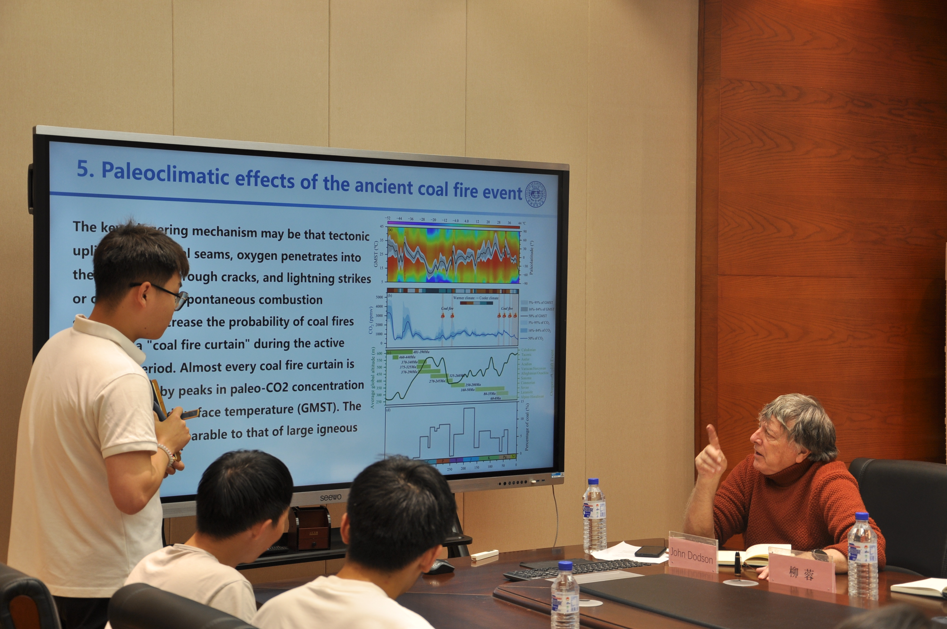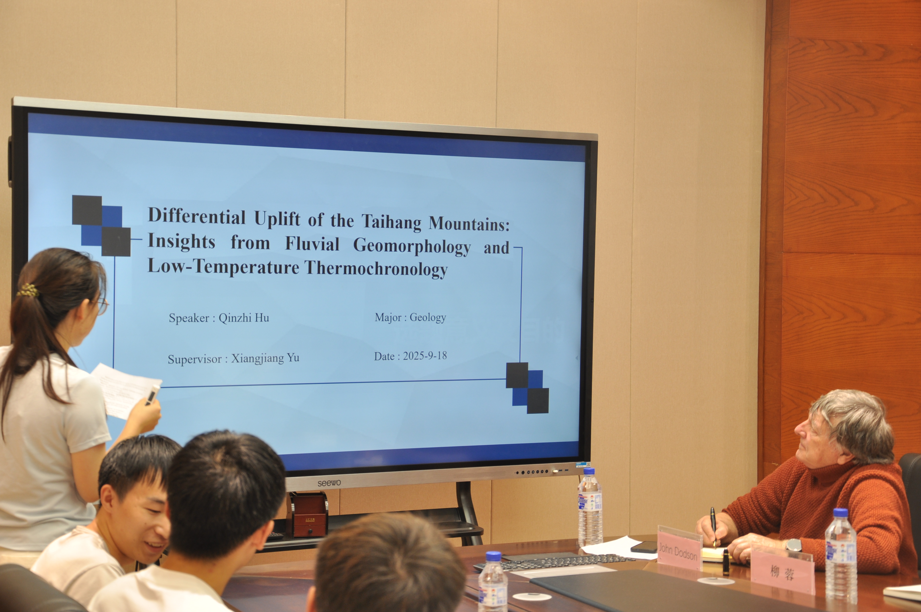 首先,柳蓉老师代表365英国上市公司对约翰·道森教授到来表示热烈的欢迎。之后,数位同学围绕地质与古环境前沿课题、聚焦不同方向展开汇报:刘高飞通过分析炭屑、分子化石与沉积记录,揭示早白垩世野火事件对古气候环境的影响;刘春龙、霍元勃、龚艳、艾常荔、陆祉薇、张浩、张海洋借助热模拟、碎屑沉积与粒度证据,探讨煤组分氧化、盆地古气候演化及冲积平原演变规律;胡钦芝、刘嘉康、郁杭玉、夏超、毕研威结合河流地貌、低温热年代学与地震剖面,研究构造隆升、地震发震机制及湖泊有机质—植硅体耦合关系。研究生们凭借其深厚的理论根基与科学的研究方法,呈现了具有创新性的阶段性研究成果,体现了他们对前沿科学问题的系统性探索与深刻思考。