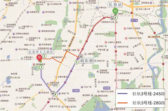 (2)长春站乘坐轻轨3号线(长春站-长影世纪城)途径5站到达朝阳桥,步行316米到达朝阳桥公交站,换乘280路(东广场-华港二手车市场)途径9站到达春城大街(北方肝胆医院),步行237米即到(全程约8km,约45分钟,3.0元)。