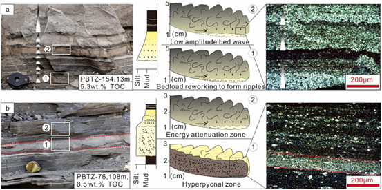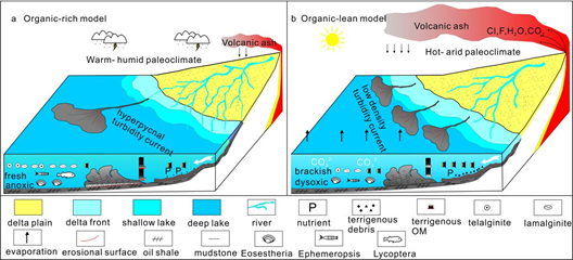 图4. 古湖沼模型,显示富有机单元(a)和贫有机单元(b)中的湖泊水文条件和沉积过程