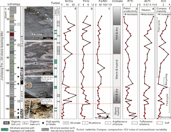 4. 元素比值、生物标志物比率和成分变异指数(ICV)表明,优质油页岩形成于弱火山活动和构造活动时期,其中OM在温暖潮湿的古气候条件下沉积。此外,湖泊系统中的缺氧底水,有利于有机质的保存(图3)。