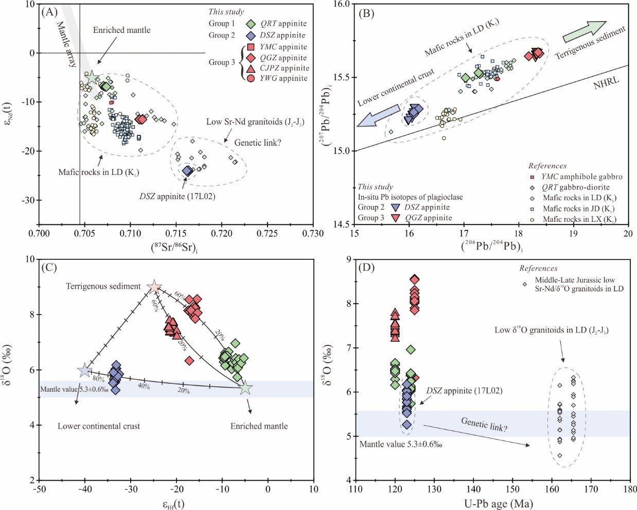 针对上述科学问题,365英国上市公司许文良教授团队的博士研究生闫相宇和杨德彬教授(通讯作者)等人,对华北克拉通东部辽东半岛地区早白垩世六个富闪侵入岩体(图1)进行了锆石U-Pb年代学,全岩主微量元素及全岩Sr-Nd-Pb同位素,并结合锆石Hf-O同位素及原位斜长石Pb同位素的系统研究(图2),得到如下认识: