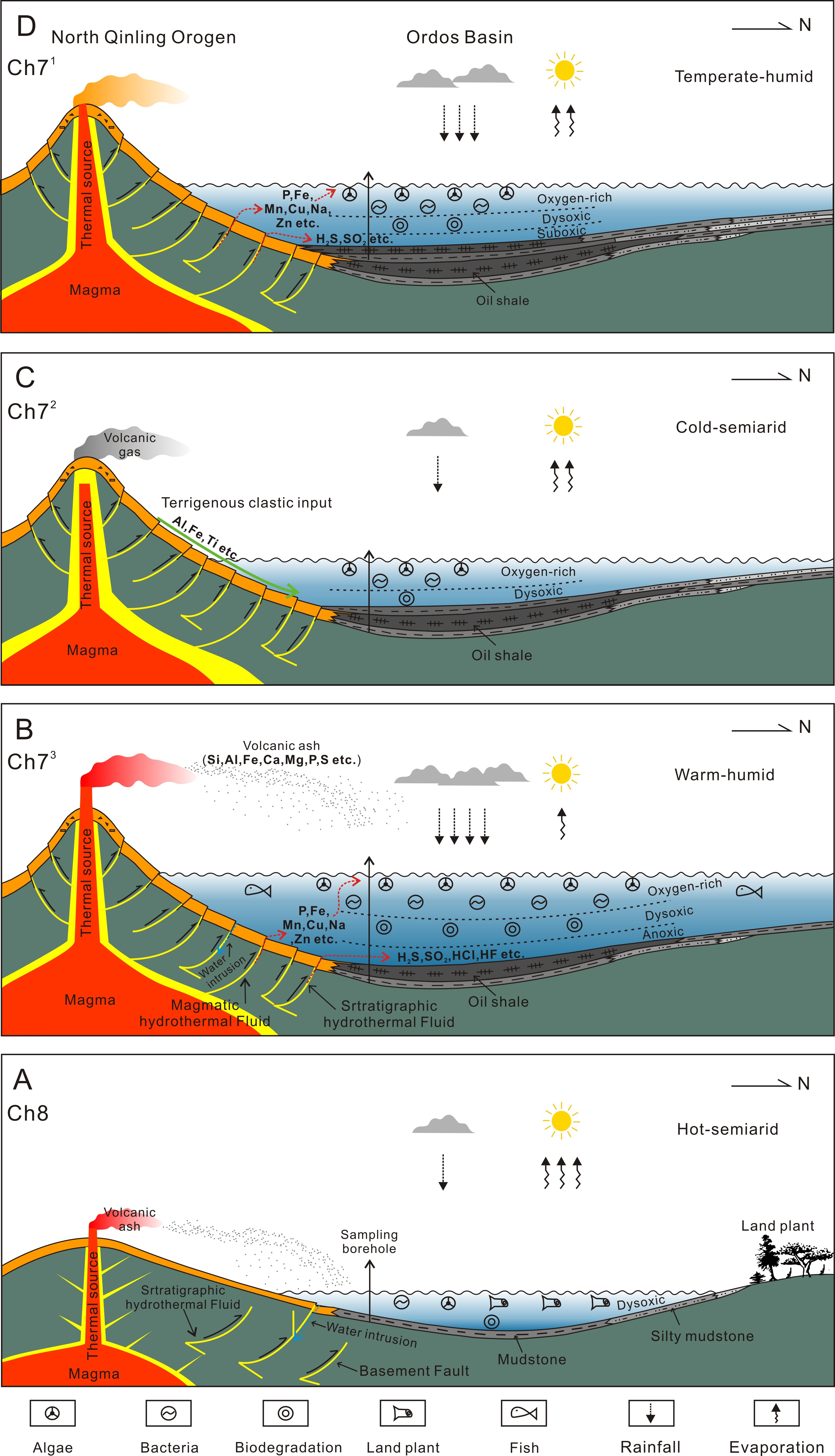地球作为一个庞大而复杂的生态系统,各个因素间都有着不同程度的联系,地质事件代表了其中某个因素的改变,但往往可能导致一系列不同的结果。主要面临火山及热液活动释放的营养元素参与湖泊生态系统循环的过程及对有机质保存条件贡献的大小依然不清楚。古气候暖化促进海平面上升而引发的海侵事件对原有湖泊生态系统中物质循环所造成影响的研究较少。