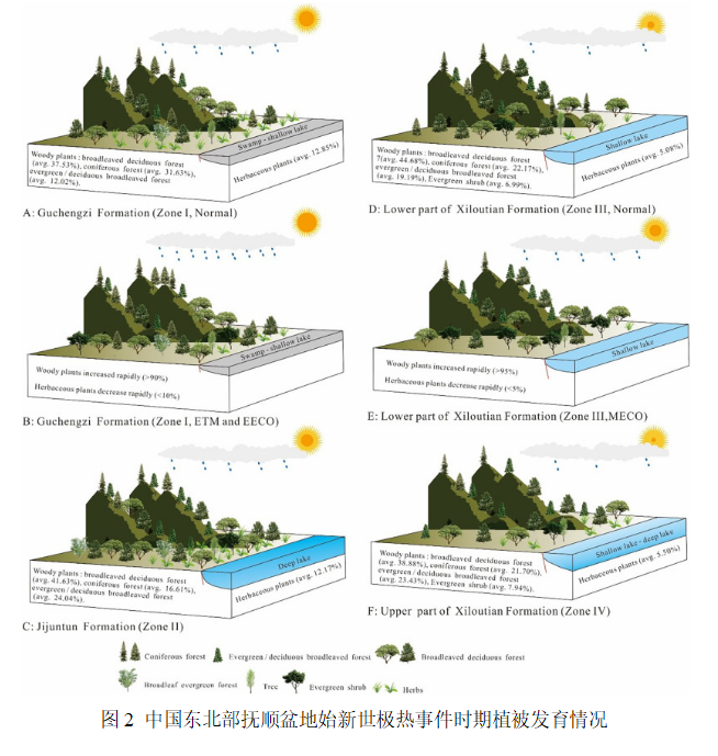 在古城子火山灰绝对年龄、生物和古地磁年龄基础上,开展了米氏旋回分析,建立了天文年代标尺,并结合CIE,在抚顺盆地始新统识别出ETM2、ETM3、EECO等极热事件,同时结合磁化率和色度与同位素的变化趋势、聚类分析,确定磁化率是进行古气候分析的有效指标。根据孢粉组合特征,确定东北地区始新统极热时期古气温上升2-5℃,降雨量增加了200-600mm,同时高温事件促使针叶树等木本植物的生长,促进了碳封存,揭示出始新世气候变暖的短期爆发导致亚洲中纬度地区植被发生重大变化,改变了景观,并改变了区域水文状况(图2)。
