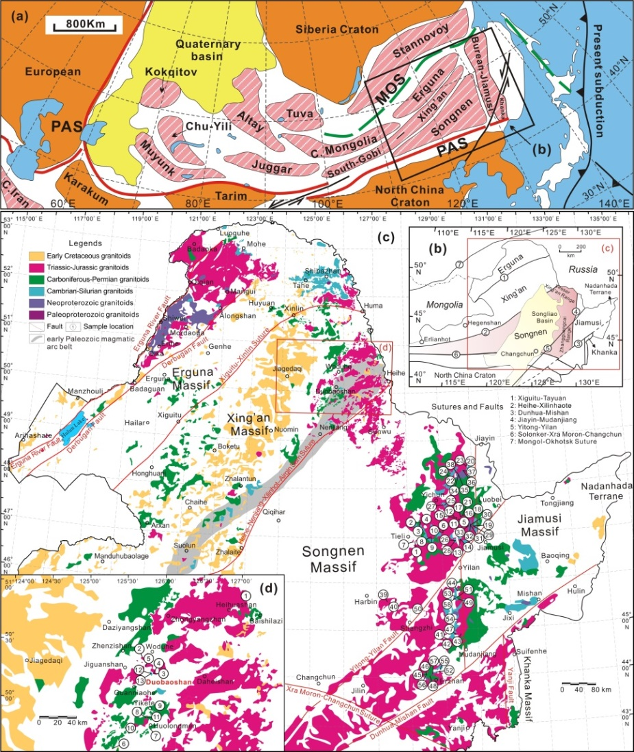 针对上述问题,365英国上市公司许文良教授团队的博士研究生龙欣雨和唐杰副教授(通讯作者)等人,对中亚造山带东段的松嫩地块和多宝山岛弧地体上广泛分布的花岗质岩石(图1)开展了系统的锆石U-Pb年代学、全岩地球化学和锆石Hf同位素研究,利用花岗岩的结晶年龄和模式年龄,建立了中亚造山带东段的地壳生长模型。取得了以下主要认识:
