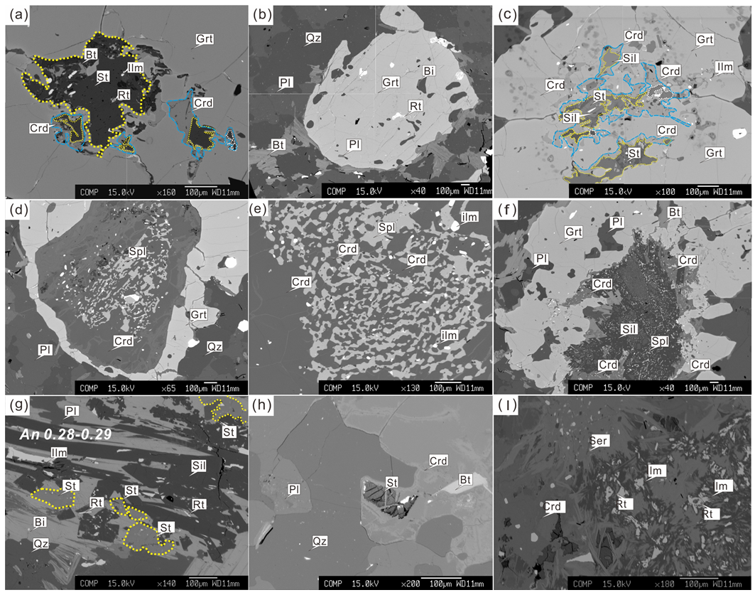 (1)Hidaka泥质麻粒岩中发育两期变质矿物组合:早期组合为十字石+夕线石+黑云母+斜长石+金红石/钛铁矿,晚期组合为石榴石+黑云母+堇青石+斜长石+石英+金红石/钛铁矿以及石榴石内部的尖晶石+堇青石±夕线石后成合晶(图2)。