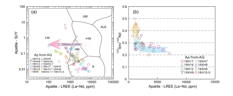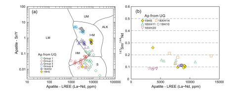 图5 未经晚期构造热事件改造的花岗岩中磷灰石的微量元素和Nd同位素组成。(a)源岩类型判别图(O’Sullivan et al., 2020);(b)147Sm/144Nd比值随LREE含量的变化