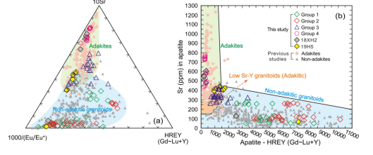 图6 磷灰石地球化学组成判别埃达克岩图解(Sun et al., 2021)
