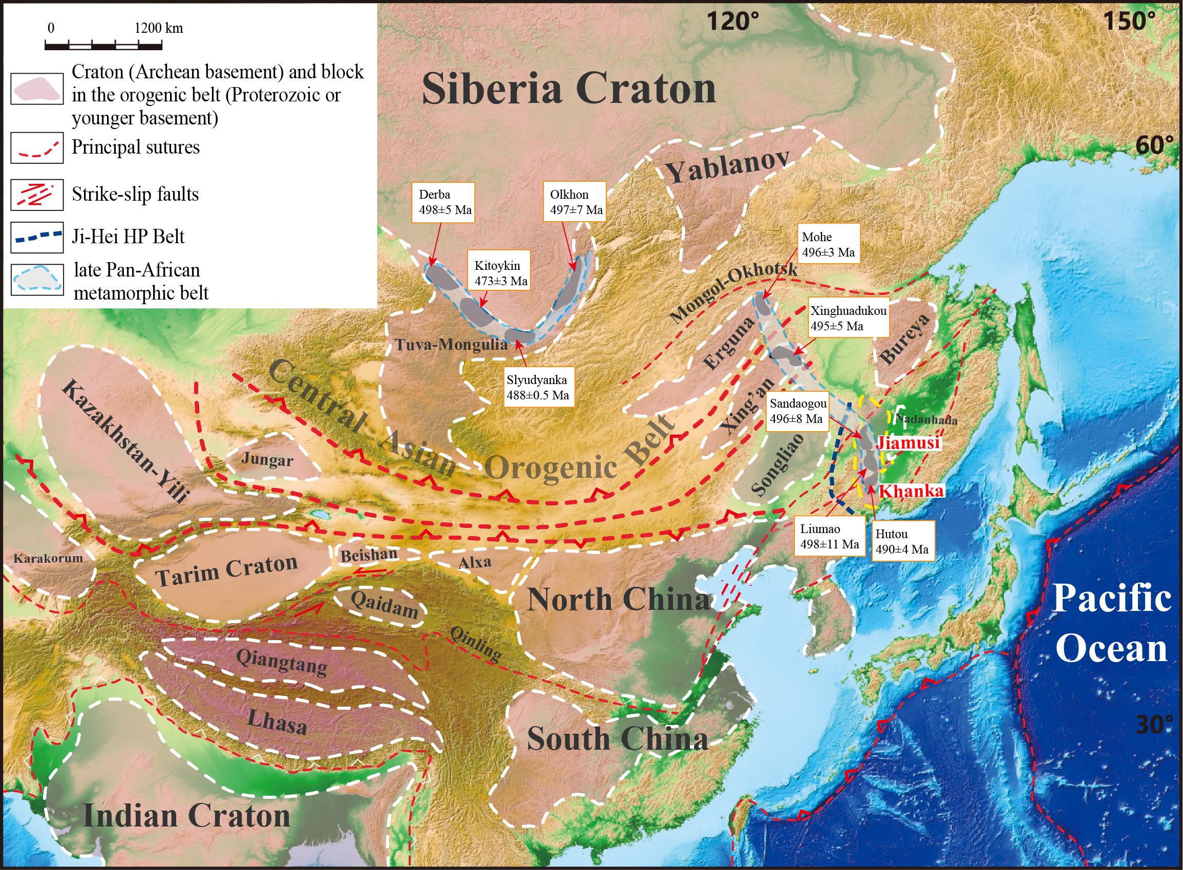 佳木斯地块的基底以麻山群为主,为一套孔兹岩系,由麻粒岩、变粒岩、片麻岩、石墨片岩以及大理岩组成。麻山群中广泛发育原岩时代为540-476 Ma的高级别变质岩(图3),且经历了晚泛非期(~500 Ma)的变质作用。这与西伯利亚克拉通南缘的Sayang–Baikal造山带麻粒岩相变质作用具有可比性(图1)。而盖层沉积显示了与其他微陆块存在一定的区别和联系(图2)。结合前人所识别的1300公里的中国东北晚泛非期孔兹岩变质带,本研究认为佳木斯地块与中国东北其它微陆块在古生代之前为统一的地块单元,且都经历了晚泛非期的变质作用,起源于西伯利亚克拉通南缘的Sayang–Baikal造山带。