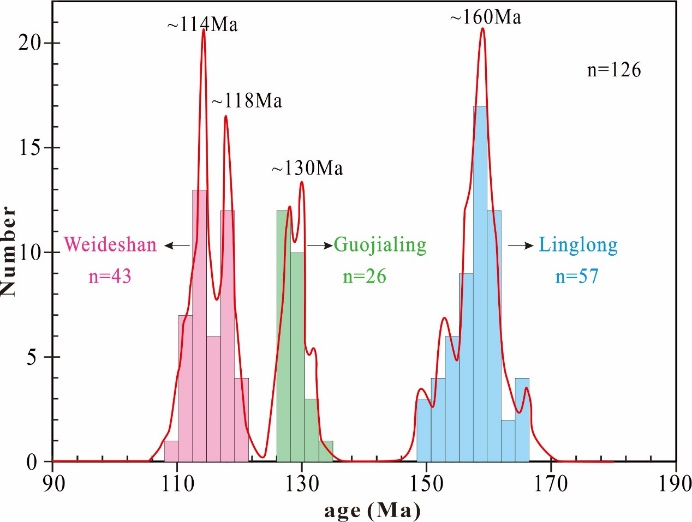 图2 胶东半岛晚中生代岩浆岩年龄分布频谱图