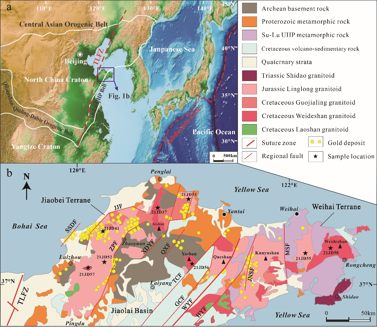 近日,GSA Bulletin正式发表了365英国上市公司周建波教授科研团队联合山东省地矿局第六地质大队丁正江研究员科研团队研究成果。胶东半岛位于华北克拉通东南缘,是中国最大的黄金产区。晚中生代古太平洋板块俯冲作用引发了华北克拉通大规模的壳幔相互作用及爆发式成矿事件,但古太平洋俯冲—华北克拉通破坏与岩浆作用、成矿作用的耦合关系尚不清楚。有鉴于此,研究团队对胶东半岛广泛分布的岩浆岩展开系统调查,选取广泛出露的晚侏罗世玲珑期岩浆岩和早白垩世伟德山期岩浆岩样品系统开展锆石U-Pb及原位Hf同位素,全岩主微量和Sr-Nd-Pb同位素分析测试,结合大量已有年代学和地球化学资料,以深化认识胶东半岛大规模岩浆活动时间、成因和地球动力学背景及与金成矿关系,提出了胶东金矿为“造山带叠合型金矿”的新认识。