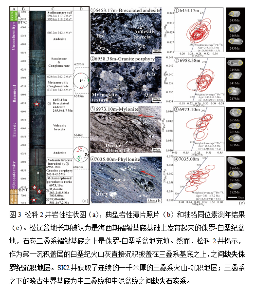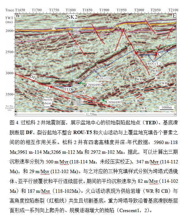 3. 初始裂陷成因对深层油气勘探的重要指导意义:本文首次厘米级精细刻画了松科2井钻穿的深层主要地质界面,包括裂开不整合(breakup unconformity, BU-T4)、裂谷起始不整合(rift onset unconformity, ROU-T5)、基底滑脱断层(basement detachment fault, DF)和三叠系-古生界基底序列内部不整合面(T6);指出了它们的成因和分布规律(图4)。这些界面的埋深通常超过五千米,是目前深层油气勘探的主力层系。基于科探井上述新发现重新建立了盆地深层的地质属性-地震响应关系,为超深层油气目标刻画提供了重要理论依据。