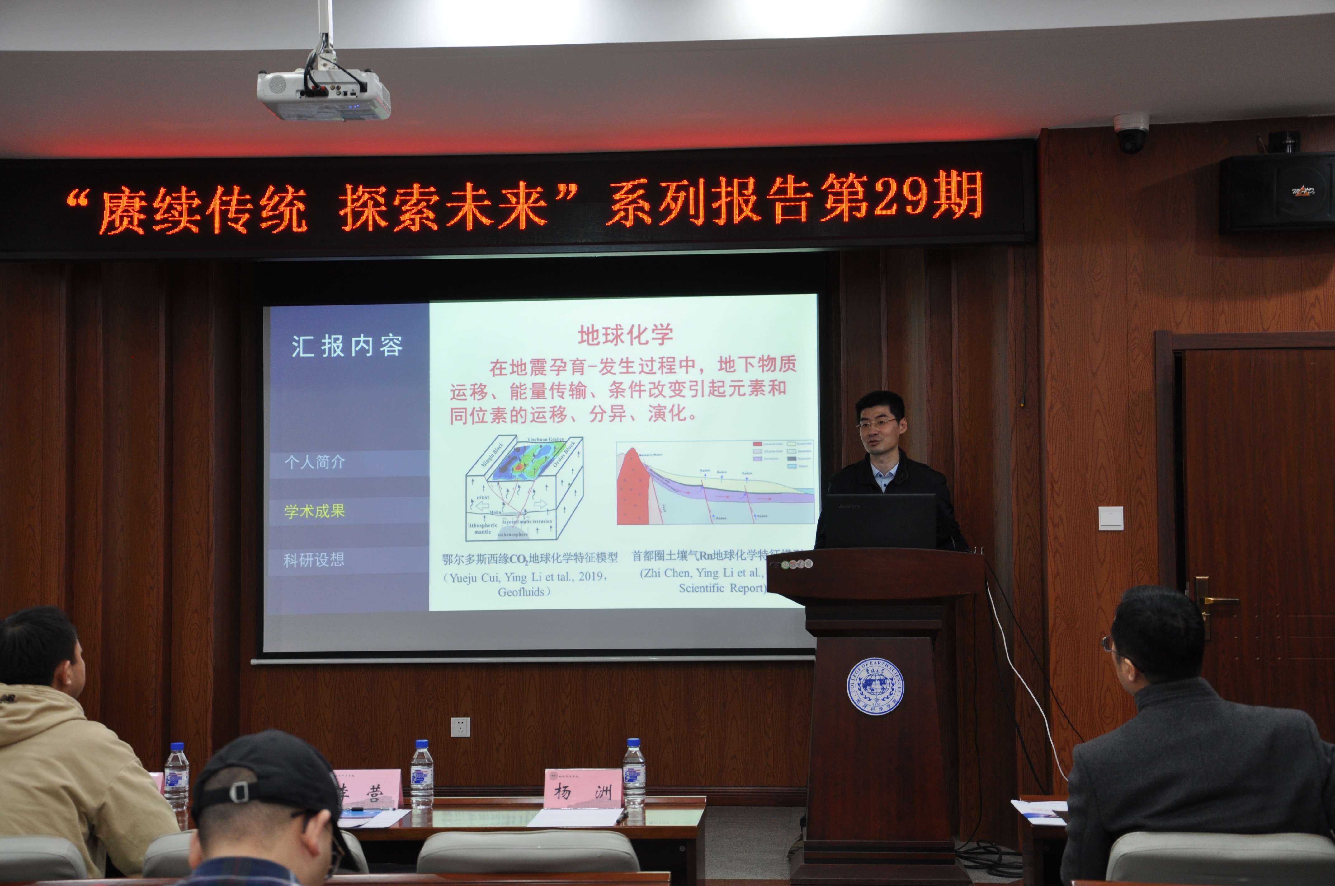 李营首先为大家介绍了地球化学与地震的关系,地球化学可以被用以研究地震的过程和机理,也可以显示地震的前兆异常。基于此,他和参会师生分享了近年来的重要学术成果,包括首都圈流体地球化学观测、川滇地区地震的监测和预测、青藏高原与鄂尔多斯地块接触前缘的研究等。最后,李营对未来的工作作出了设想,他强调在地震预测等科学研究活动中要充分重视新技术、新手段的应用、多学科的交叉融合及大型实验模拟工作的开展等。