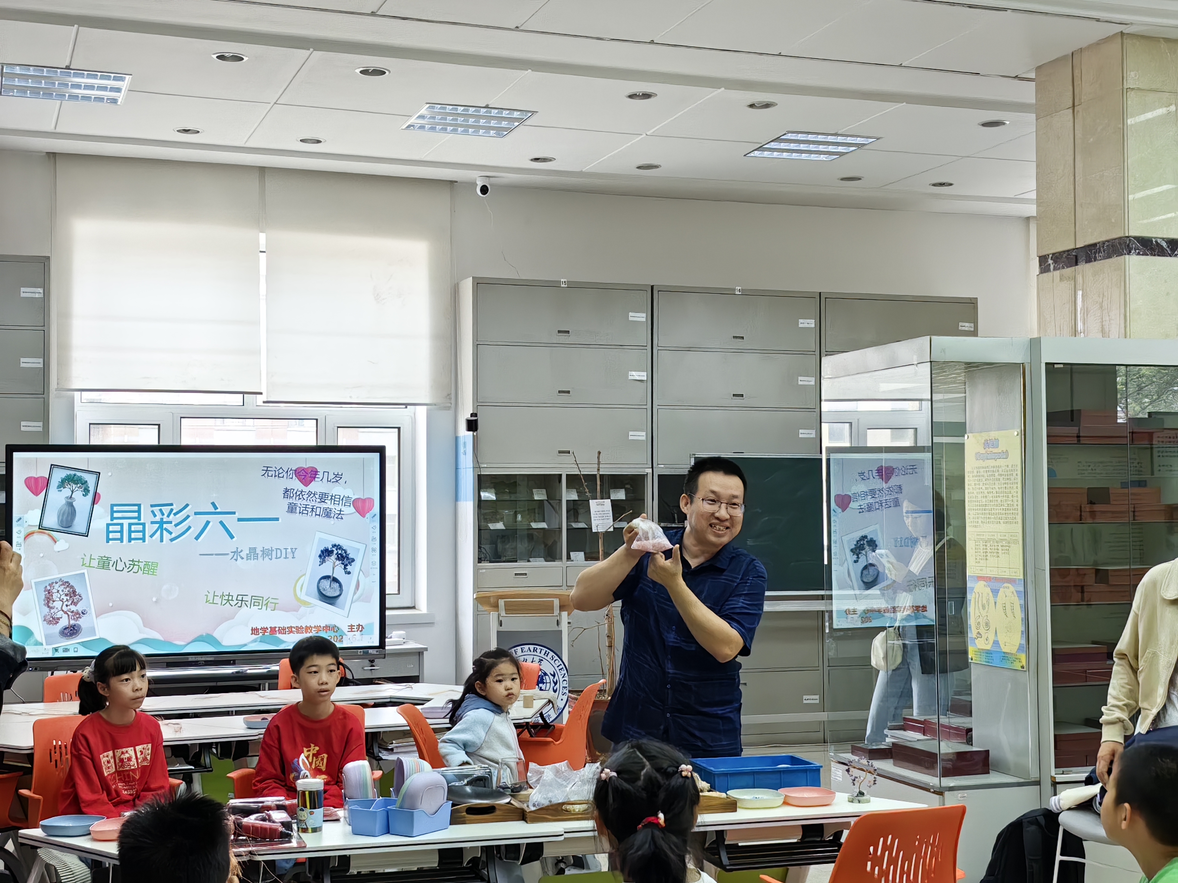 在“六一”国际儿童节到来之际,为进一步推广地质文化知识,推动地质与文创、研学活动的深度融合,激发员工创新实践的兴趣与积极性,培养创新创业实践能力,实验教学中心由“盘古开天”员工创业训练团队面向全校开展“聚石成梦·晶彩六一|水晶树DIY奇幻工作坊”活动;由实验技术人员面向公司教工及子弟开展“晶彩六一*水晶树DIY”亲子体验活动。