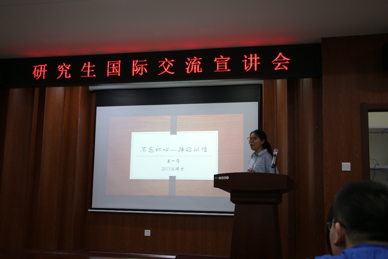 活动邀请了国家公派联合国实习生2016届员工徐政雪,国家公派联合培养博士2015级博士研究生徐久磊、王一存,台湾交换学习2015级硕士研究生常文博进行分享交流,本次交流会由杨德彬副经理主持。徐政雪为大家分享了申请联合国实习生、联合国志愿者的途径,以及参加联合国教科文组织期间进行的“国际水文计划”拉丁美洲及加勒比海地区项目组的经历。徐政雪通过在联合国实习感受到“人的成功更多地表现在爱与被爱”,并用自己从员工到联合国实习生再到贵州省侗族大寨公益组织创始人的经历,向大家展现了自己是如何通过国际交流锻炼了自己多方位的能力,为同学们未来的选择方向打开了更多的思路。