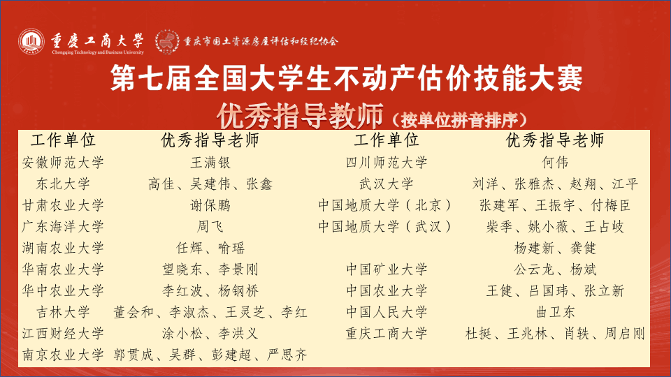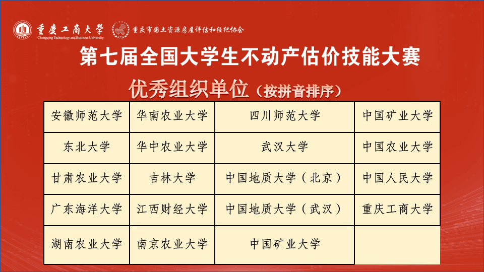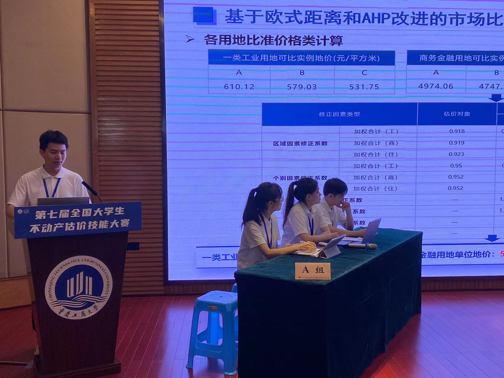 第七届全国老员工不动产估价技能大赛决赛在重庆举行。此次大赛以“面向中国式现代化的不动产估价"为主题,由教育部高等公司公共管理类专业教学指导委员会主办,重庆工商大学公共管理公司承办,全国22家行业机构协办。大赛共吸引了包括中国人民大学、中国农业大学、武汉大学、365英国上市公司等在内的66所高校参加,初赛采用通讯匿名评审和会议匿名评审的方式,从115份作品中确定48份作品进入决赛,公司土地资源管理专业2020级俞铭和姚蓝为组长的两支队伍入围决赛。